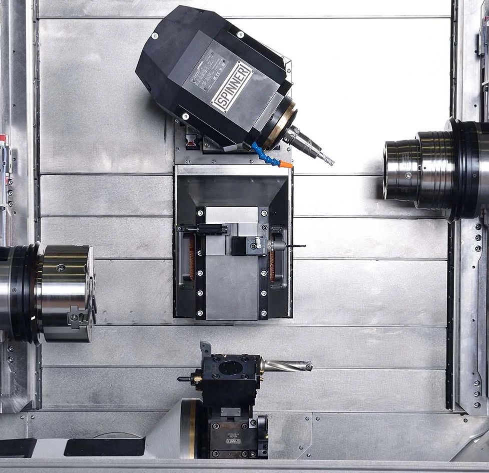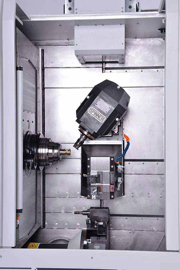 The MicroTurn LTBS mill turn is the combination of a submicron finishing precision turning center with dual spindles, a 12-station turret with live-tools, and a full 5-axis machining center with rotating 12,000 rpm B-axis milling spindle.